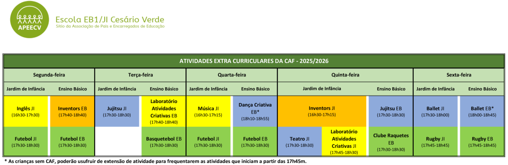 • 17:30 – Fim das atividades letivas diárias (inclui horário de AEC)